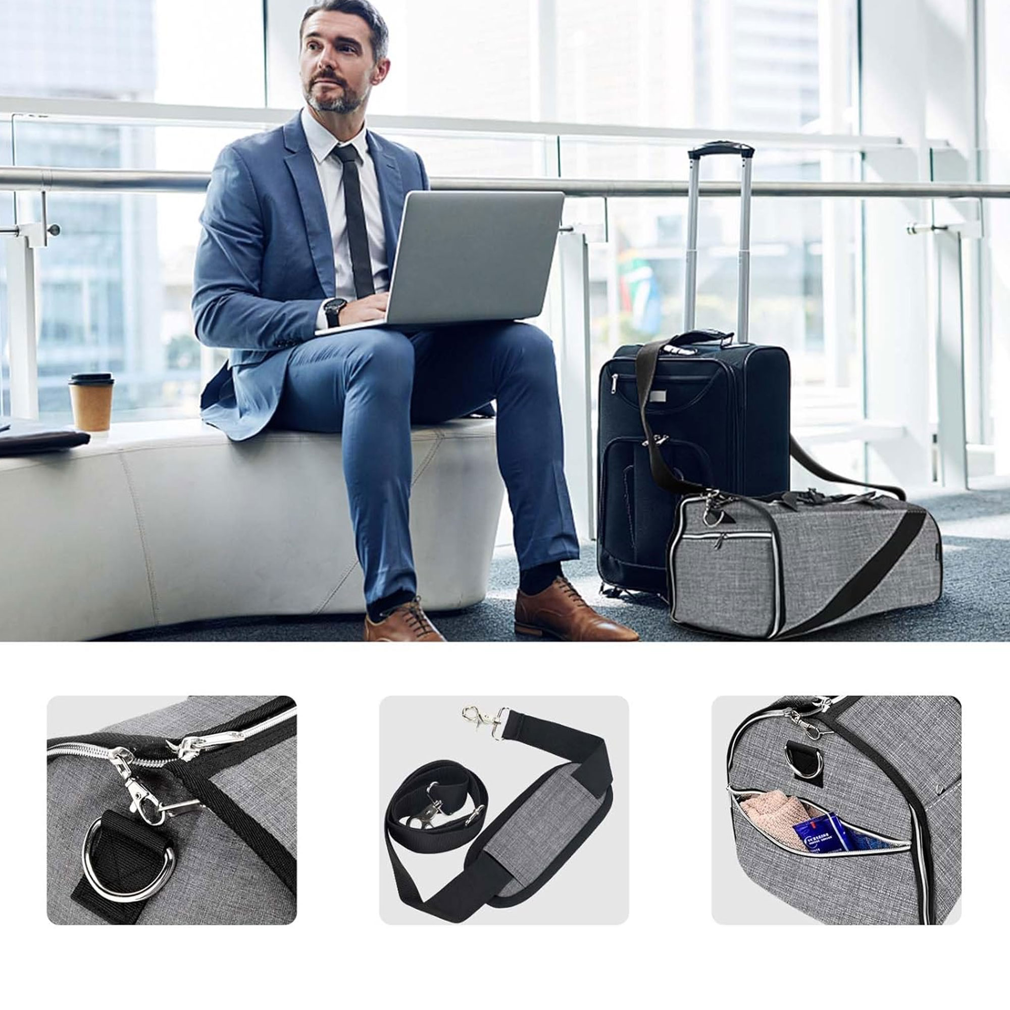 لماذا هي الخيار الأول للمحترفين؟ ✔ تصميم 2 في 1 عبقري: تدمج بين "حافظة الملابس" (Garment Bag) لحماية البدلة من التجاعيد، و"شنطة الدافل" (Duffel Bag) الواسعة لباقي الأغراض. ✔ جيب مخصص للأحذية: جيب جانبي مستقل ومعزول لوضع الحذاء فيه دون أن يلامس ملابسك النظيفة. ✔ مساحة تخزين ذكية: رغم شكلها الأنيق، فهي "عملاقة" من الداخل ومزودة بجيوب متعددة للابتوب، الأوراق، والجوال. ✔ مقاومة للماء والخدش: مصنوعة من قماش بوليستر عالي المتانة يحمي أغراضك الثمينة من المطر والغبار. ✔ مريحة في الحمل: تأتي بحزام كتف مبطن قابل للتعديل، ومقابض يد جلدية مريحة، وتصميم يركب على مقبض حقيبة السفر (Trolley Sleeve). ✔ مثالية للطائرة: أبعادها مطابقة لمواصفات "حقيبة الكابينة" (Carry-on) في معظم خطوط الطيران.